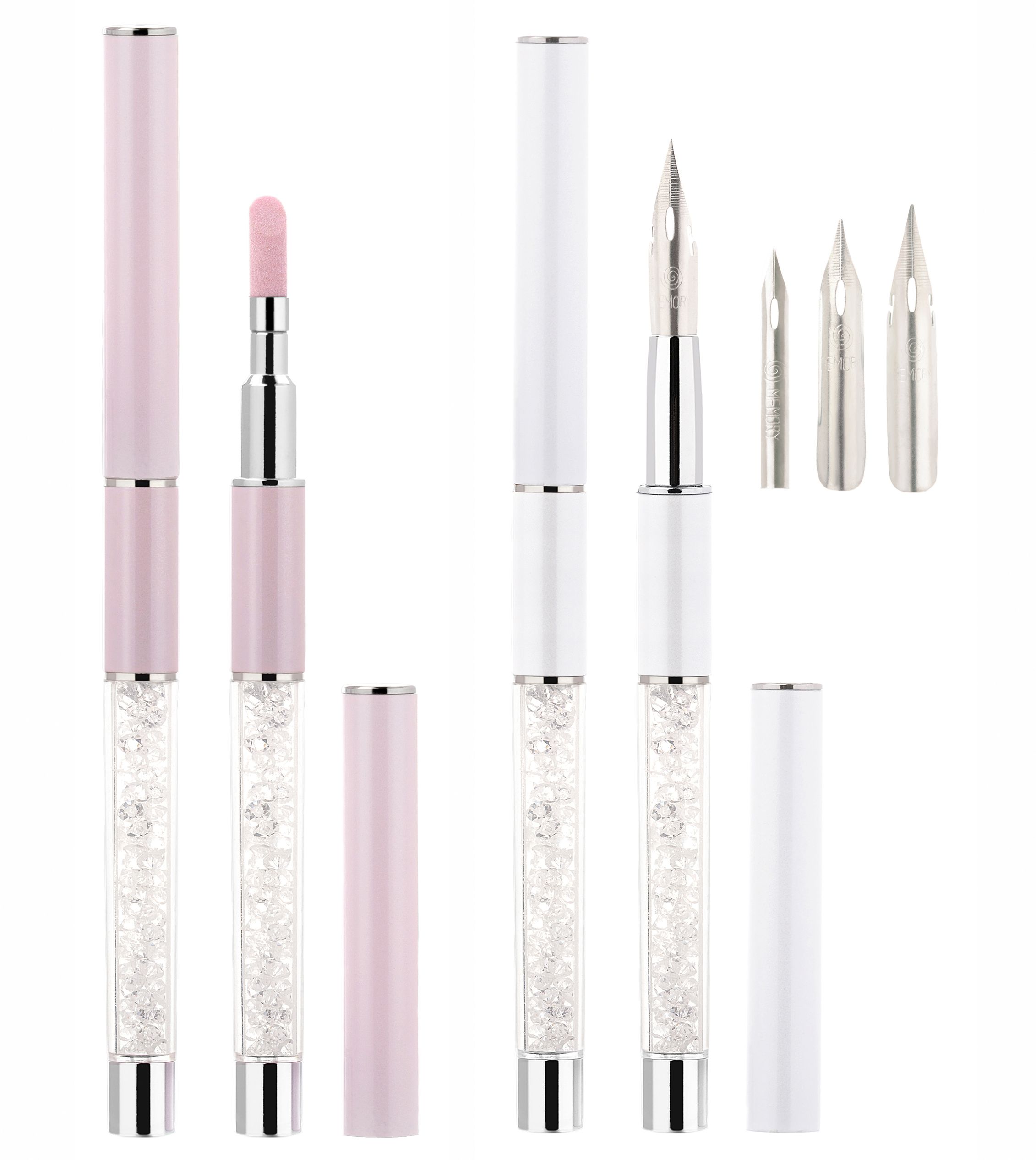 A multifunctional 2-in-1 nail art pen with elegant crystal handle, featuring a metal nib for fine detailing and a soft sponge for gradients and powders. Includes 4 replaceable nib tips – perfect for gel polish, calligraphy, and nail art decoration.