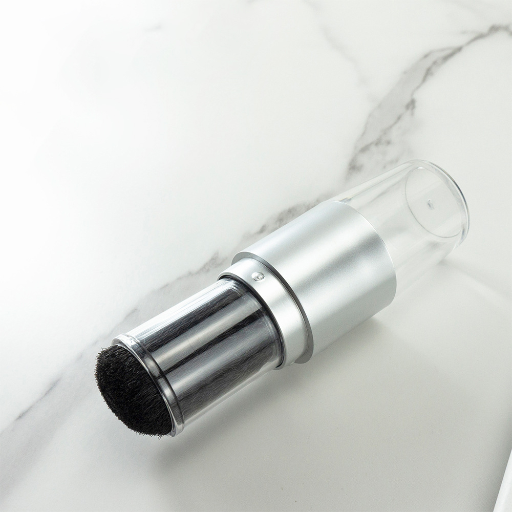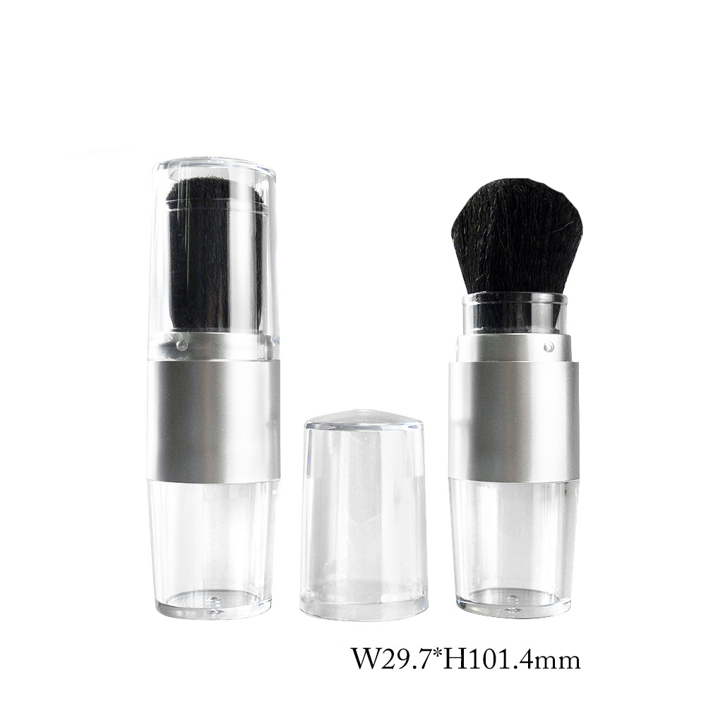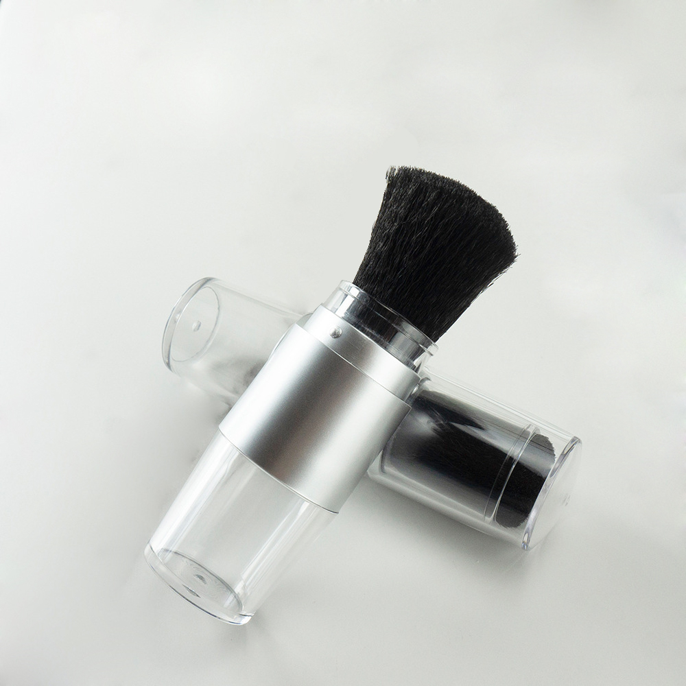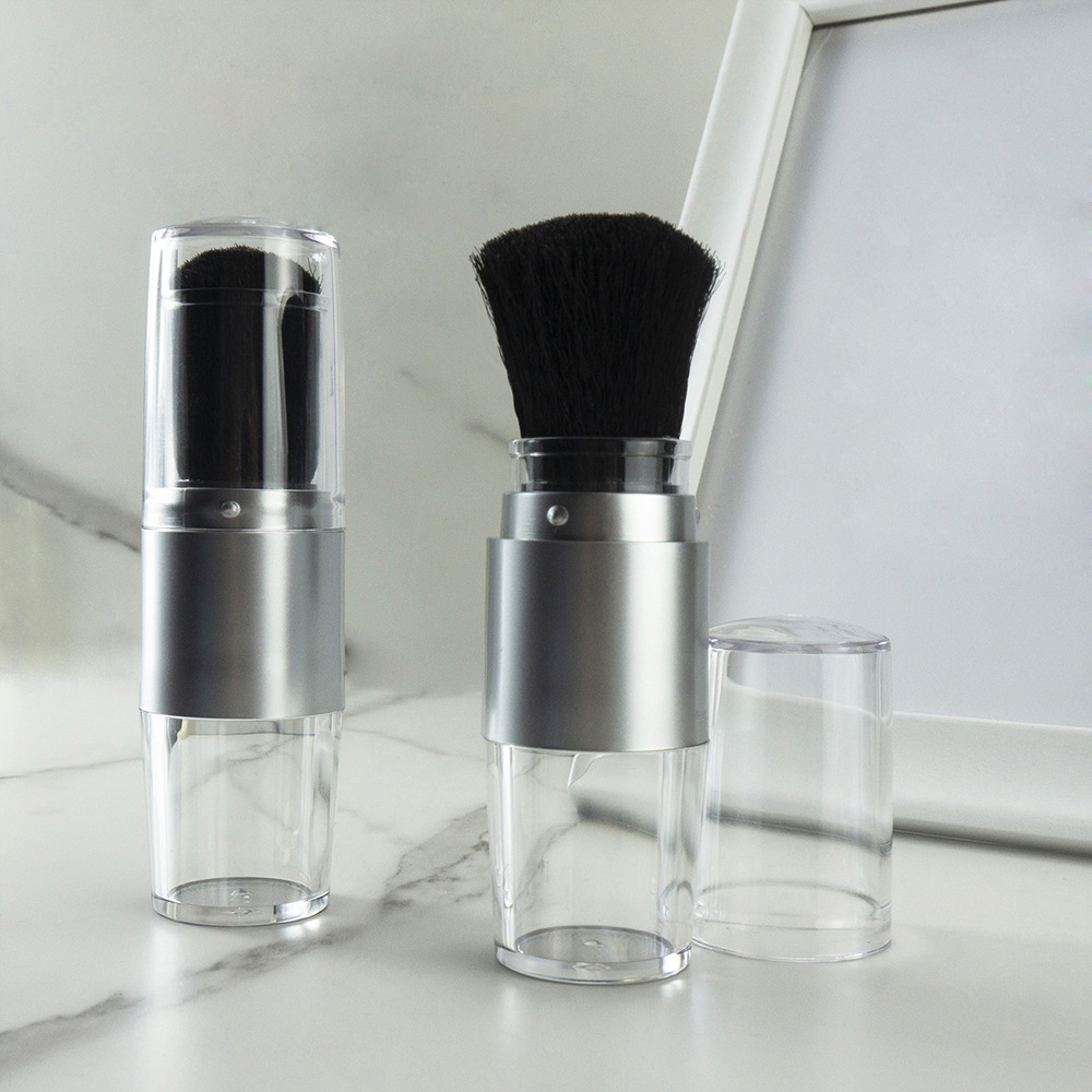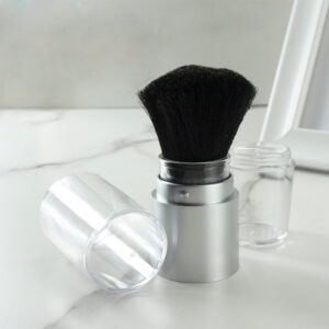 The Custom Refillable Loose Powder Brush with Clear Jar is designed for effortless powder application and easy refill. The built-in transparent container allows users to store mineral powder, loose powder, or SPF powder conveniently. With its soft black synthetic bristles and durable silver casing, this portable powder brush is a must-have for beauty brands and cosmetic distributors looking for private label or OEM/ODM options.