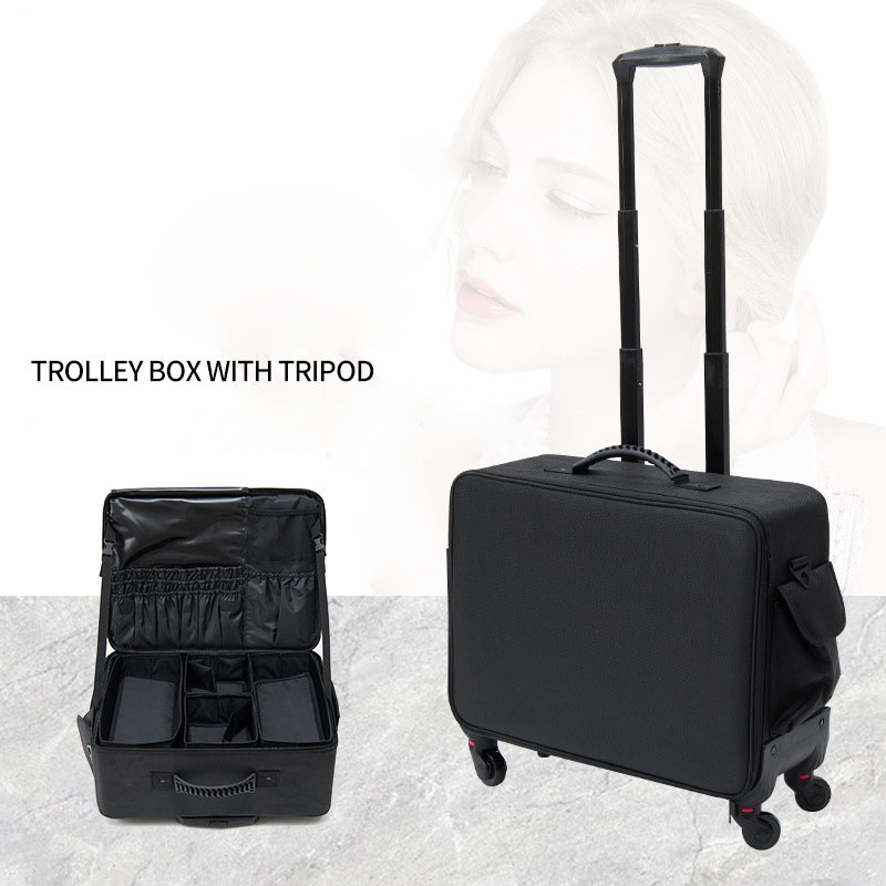 Professional Makeup Trolley Case with Tripod Stand – Rolling Cosmetic Organizer with Adjustable Dividers & 360° Wheels