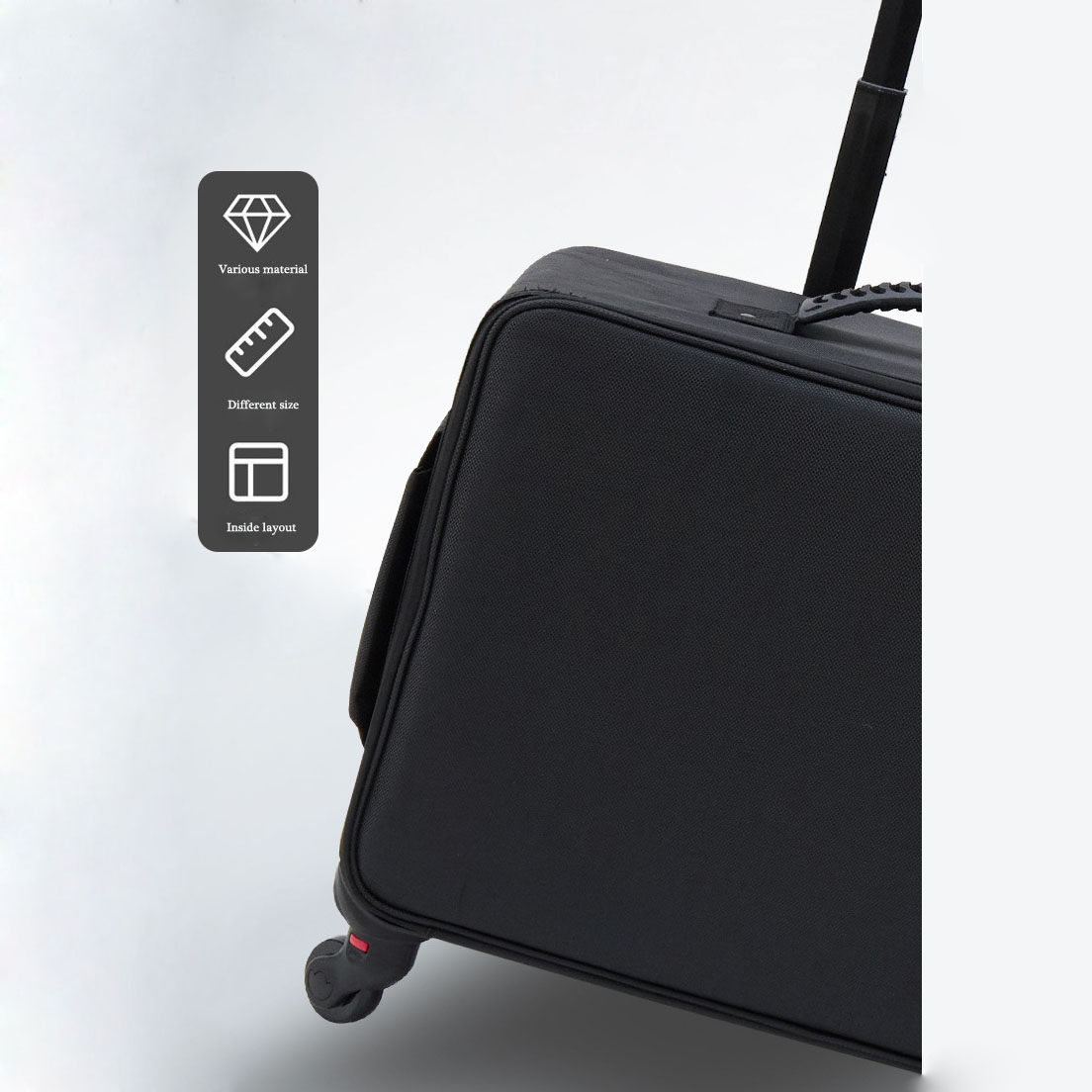 This professional makeup trolley case features a built-in tripod stand, spacious compartments with adjustable dividers, and smooth 360° spinner wheels. Designed for makeup artists, salons, and beauty professionals who need organized, portable, and reliable storage on the go.